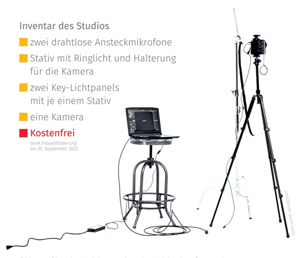Aber: all diese Vorhaben gelingen besser mit der richtigen Ausrüstung. Im Herbst 2021 hat die BAG-SB im Rahmen des Projektes Ausbildungsoffensive digitale Schuldnerberatung die Gelegenheit genutzt, ein mobiles Studio anzuschaffen, das für alle Mitglieder und Partner zur Verfügung gestellt werden kann.